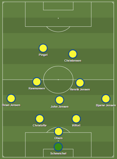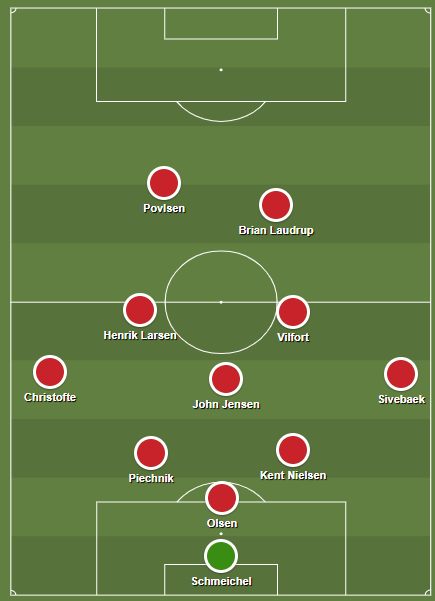 Turnuva başlayınca Michael Laudrup’tan yoksun Danimarka takımı, savunmada 5-3-2 dizilişini andıran aşırı defansif bir anlayışla ve hücumda 3-3-4-0 şeklinde “santrforsuz” olarak konumlanacağı bir taktikle sahada yer aldı. Fizikli ve statik üç merkez savunmacının önünde, turnuvadaki performansının ardından Arsenal’e transfer olacak sert orta saha oyuncusu John Jensen yer alıyordu. Kanat bekleri Christofte ve Sivebaek’in ise ilk düşünceleri ise hücum etmek değildi. Hal böyleyken takımın hücum stratejisi uzun toplarla ileri bölgedeki uzun boylu oyuncular Kim Vilfort ve Flemming Povlsen’i buluşturmak ve onların indirdiği toplarla takımın hızlı ve yetenekli tek oyuncuları olan Brian Laudrup ve Henrik Larsen’in atakları ile sonuca gitmekti. Öyle ki aslında yukarıdaki dizilişe göre takımda net bir santrfordan söz etmek de mümkün değildi. Çünkü Vilfort ve Povlsen’in asli görevleri topu yere doğru şekilde indirip oyun kurmaktı.