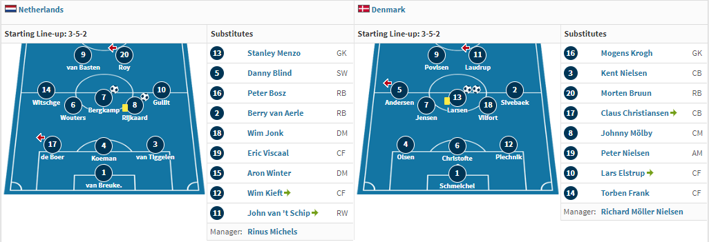 Hollanda’nın ilk 11’ine bakıldığında, Danimarka’nın yaptığı işin büyüklüğünün ne olduğu daha iyi anlaşılacaktır. Rinus Michels’in çalıştırdığı ve bir önceki sezon kadrodaki her oyuncunun neredeyse bir şeyler kazanarak o turnuvaya geldiği bu efsanevi takım bugüne kadar benim izlediğim en iyi takımlardan biriydi. Kadronun iskeleti olan oyuncular Ajax ve Milan’da oynuyordu. Ajax o sezonu UEFA Kupası’nı kazanarak tamamlarken, Milan da Serie A’yı yenilgisiz şampiyon olarak kazanmıştı. Kırmızı-siyahlıların efsanevi trio’su Van Basten-Gullit-Rijkaard kariyerlerinin zirvesindeydi. İşte turnuvadan sadece 11 gün önce ilk antrenmanını yapan Danimarka, böyle bir takımı yenerek finale uzanıyordu. Davut-Golyat hikayesinin yeşil sahalarda vücut bulmuş hali bu olmalıydı…